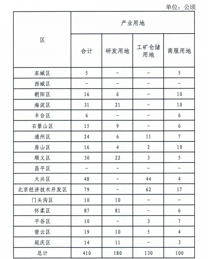 参照《北京市2020年度建设用地供应计划》,预计2020年北京工矿仓储用地供应130公顷,其中经开区与大兴区是供应主力,预计超过80%的工矿仓储用地来自京南区域。《北京市2020年度建设用地供应计划》显示,北京2020年产业用地供应410公顷,包括180公顷研发用地、130公顷工矿仓储用地和100公顷的商服用地。分摊至北京十六区和经开区,西城、昌平无产业用地供应,怀柔一区供应87公顷产业用地(81公顷研发用地、6公顷商服用地),占据北京各区供应榜首位,成为北京研发用地的主要来源地。