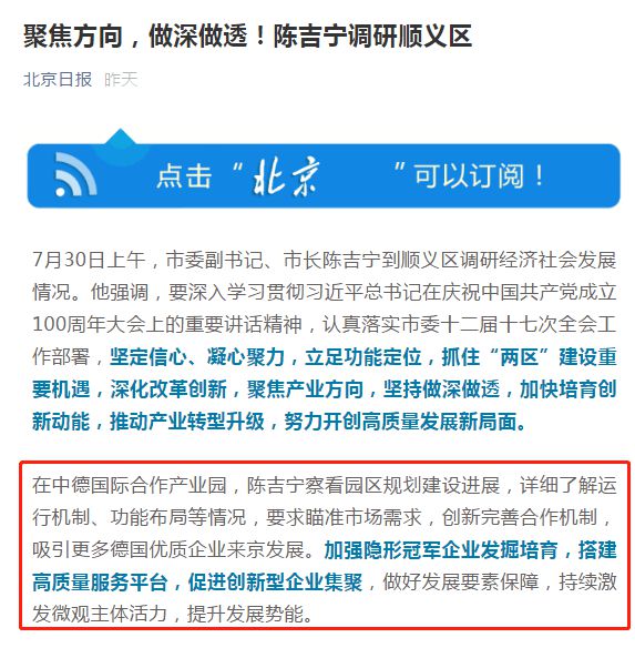 陈吉宁对园区管理机制及招商运营成效予以肯定,要求中德产业园瞄准市场需求,持续激发微观主体活力,创新完善合作机制,加强隐形冠军企业发掘培育,吸引更多德国优质企业来京发展。