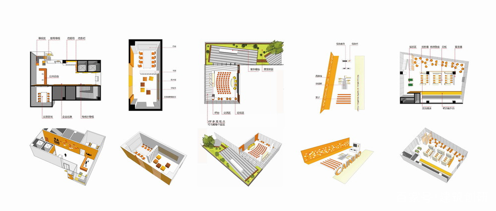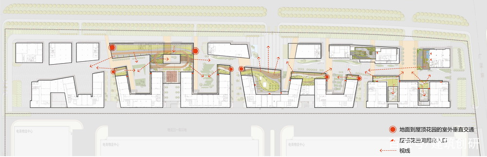 品牌形象:在设计生成过程中,本项目根据狭长用地的特点,形成四个主题空间,并在中部形成内街,将主题空间有效串联。四个主题空间充分体现了菜鸟及阿里巴巴的品牌特点,并切实为电商服务,承载了庆典、集散、展销活动、商业配套、电商网络交流、电商休闲生活等众多功能,形成复合的社区。规划布局考虑到菜鸟及阿里集团开放高效的企业文化,所有活力空间面向城市界面展开,呈现开放的姿态。