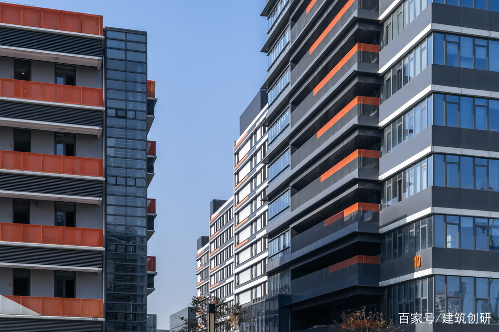 特色墙身设计,外廊挑檐设计通过自遮阳实现被动式节能。横向造型结合分体空调室外机位,设备安装简便,易维护。底层采用玻璃幕墙,增加园区品质感。三层外廊直通室外平台,每栋楼都有自己的共享露台。