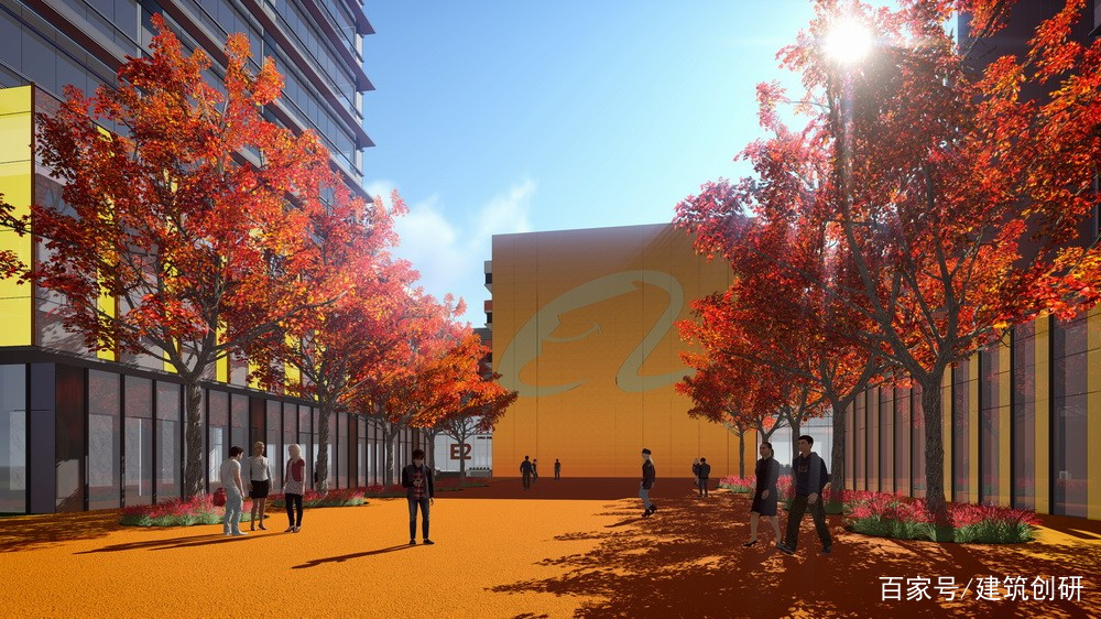 与导视结合的景观铺装,地面橙色导视带增强后排建筑门厅的可达性,通过橙色的地面色彩将导视需求转化为产业园的特色景观。