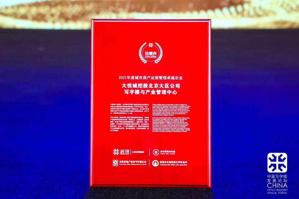 大悦城控股北京大区公司写字楼与产业管理中心获“2021年度城市资产运营管理卓越企业”