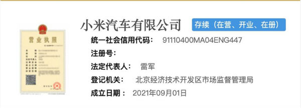 9月1日,小米宣布小米汽车正式完成了工商注册,公司名:小米汽车有限公司,注册资金100亿元人民币,小米集团创始人、董事长兼CEO雷军亲自出任法人代表。