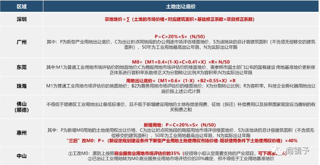 总结来说,深圳根据产业类型区别考虑;广州惠州取同期同地段商服用地市场评估楼面地价20%;东莞根据自持比例取普通工业用地与商业服务业用地综合后的40%,自持多则更偏向工业用地,自持少则更偏向商服用地。