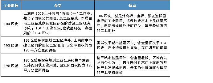 不同于其他城市的新型产业用地政策,上海根据工业用地的区域及产业发展特点,将工业用地划分为104区块、195区域和198区域。通过不同的工业用地政策,对不同区域进行针对性管控,形成精细化、集约化发展。