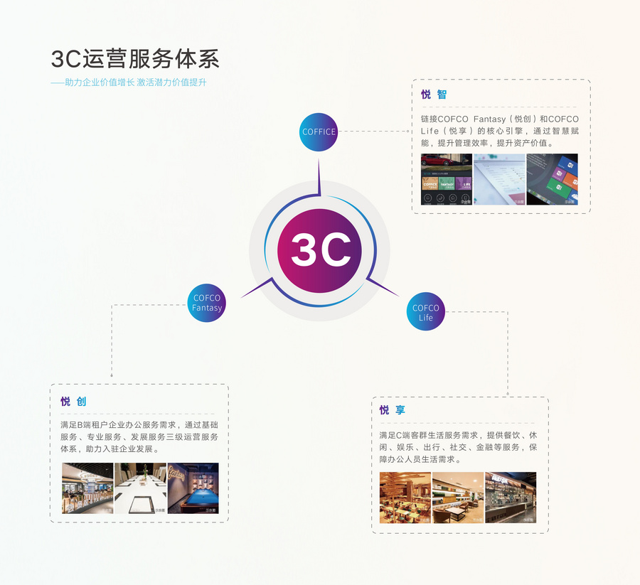 前有建国门核心商务区的中粮广场与二环安定门外大街的中粮·置地广场成功运营经验,充分利用互联网、大数据搭建智慧运营平台,领跑写字楼重度运营时代;创新注入3C运营服务体系,打造行业办公顶配标杆;秉承中粮集团的优质运营基因,E_ZIKOO智慧谷也同样独具前瞻视角,布局3C运营服务体系:通过智慧云平台为租户企业提供高效解决方案的运营体系,同步满足B端入驻企业办公服务需求与C端客群生活服务需求,为企业提供符合需求的产业服务及相关配套,激活空间价值潜力,赋能企业发展。